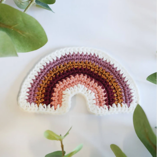 Regnbuen her er ca. 10,5 cm bred og 6 cm høj, men det er også beskrevet i opskriften hvordan du nemt kan tilpasse størrelsen.