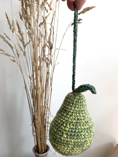 Pæren er hæklet i dobbeltgarn /dobbelt tråd (2 x 8/4 garn) på nål 3-3,5.