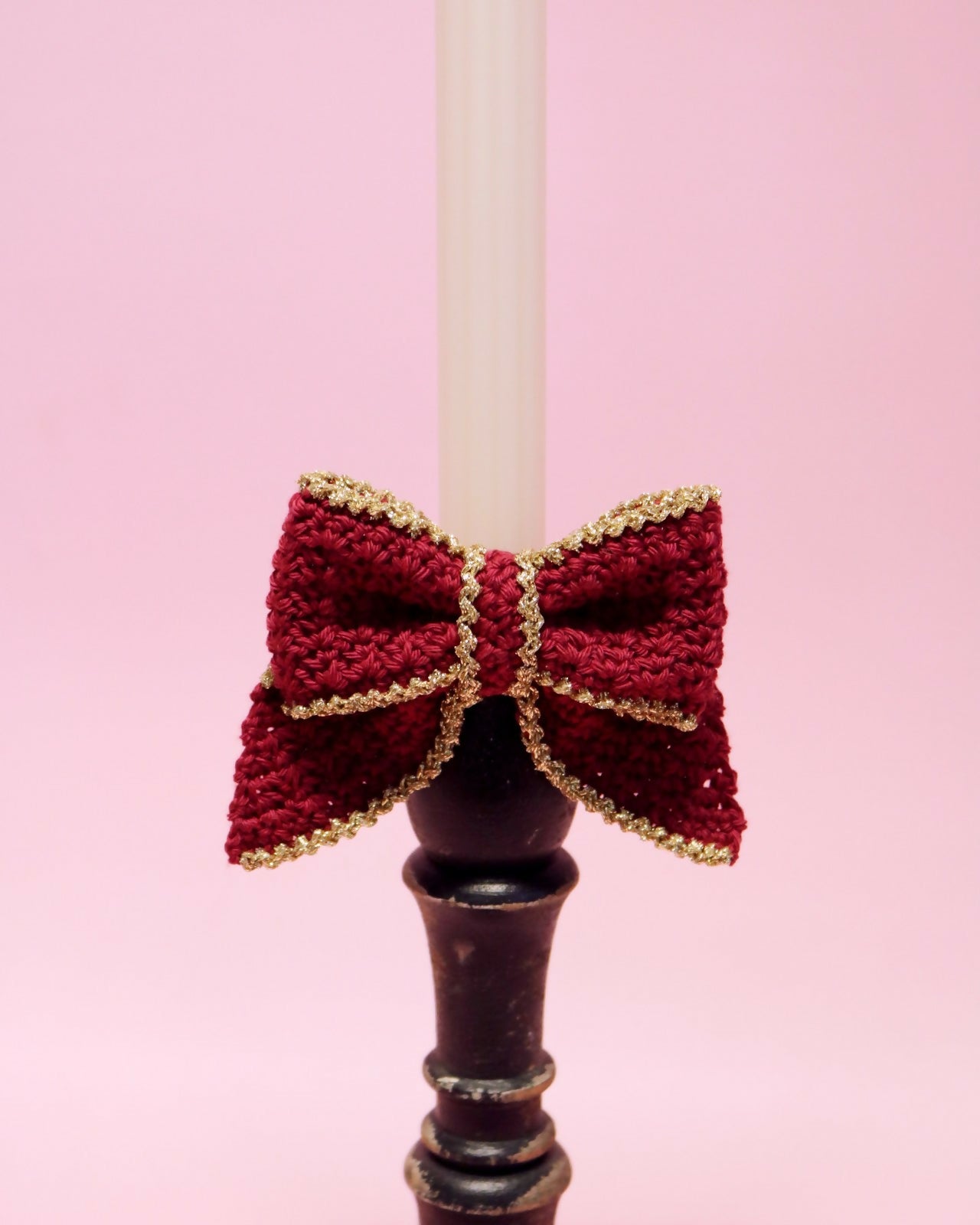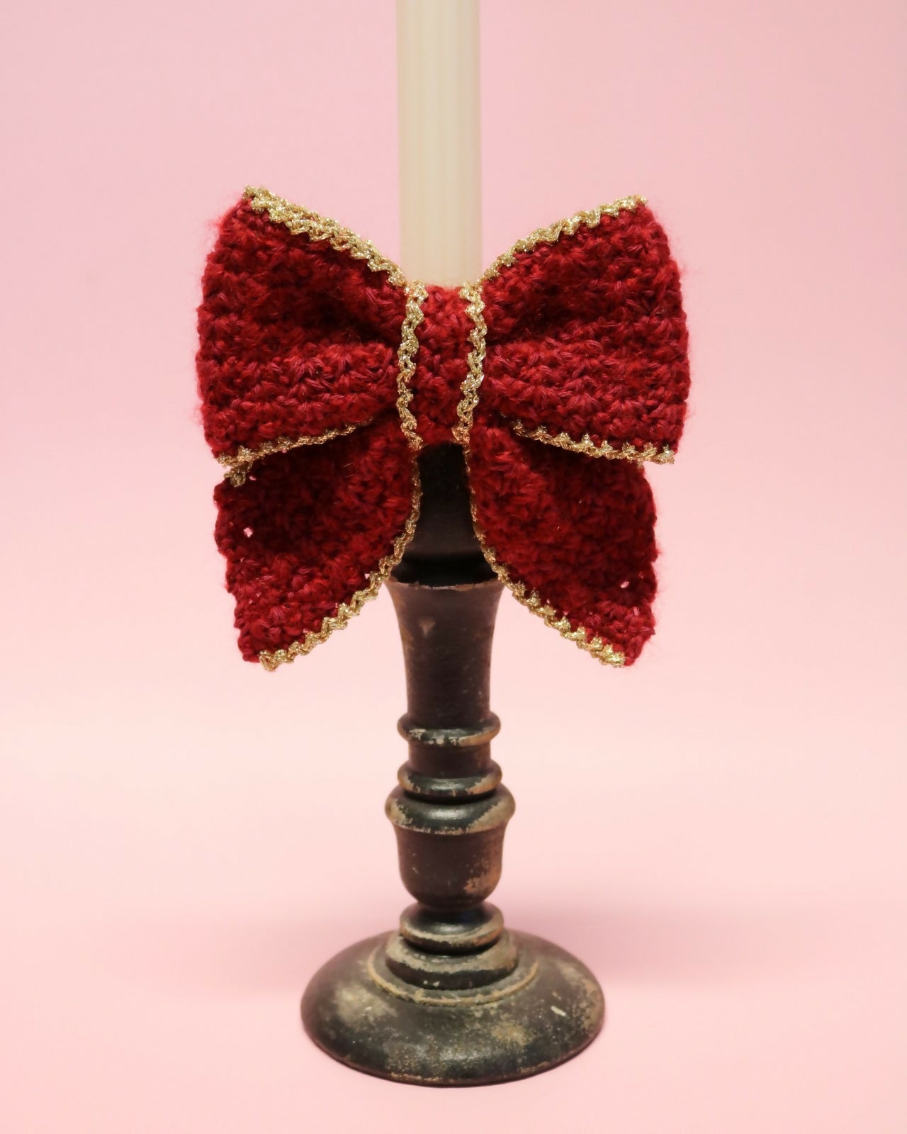 – Du kan evt. bruge guld garn til at lave en guld kant på sløjfen – der skal bruges 1-2 g.