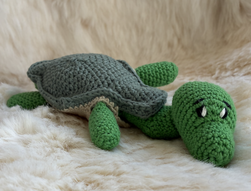 Skildpadden måler ca. 20 cm fra snude til hale. Det meste bliver hæklet sammen, med der er lidt montering ud over.
