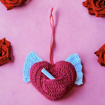 Hækl et smukt kærlighedshjerte med vinger, der rummer en lille lomme til en kærlighedserklæring eller en sød besked til en, du holder af. Dette hæklede hjerte er en personlig og unik gave, som med garanti vil blive modtaget med glæde - uanset om det bruges til Valentinsdag, bryllup, mors dag eller bare som en kærlig overraskelse i hverdagen.