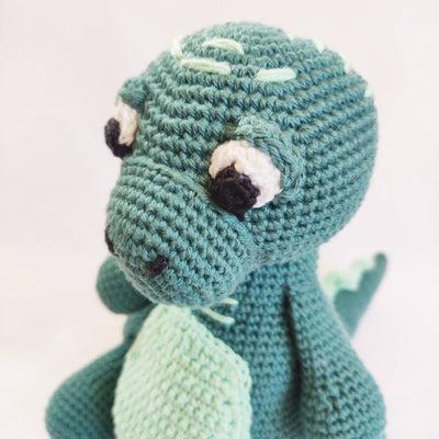 Dino Danny er en fantasi-dinosaur og desværre ikke en speciel art. Det var egentligt min mening at lave en dinosaur af en bestemt art, men de er ærlig talt ikke særlig søde, og denne Dino skulle være en barselsgave til en ny lille verdensborger. Så her kommer en ny art, en sød dinosaur art :-)