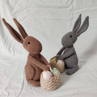 hækleopskrift på påskehare med kurv. Haren bliver ca 25 cm i højden. Opskriften skulle gerne være nem at gå til, der er mange billeder og forklaringer der guider dig igennem opskriften