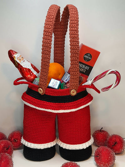 Når Julebukserne laves i bomuld med dobbeltråd, så bliver den ca. 21 cm uden seler.