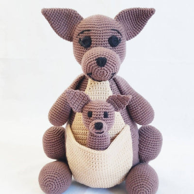 Kænguruen Karla bliver ca. 25-30 cm, når hun er færdig og hæklet i 8/4 bomuldsgarn på nål 2,5 mm, alt afhængig af fastheden.