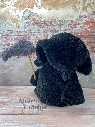 Manden med Leen bliver 33 cm. hvis du bruger samme garn og hæklenål som mig. Du kan sagtens bruge en anden nål og andet garn, hvis han skal være større eller mindre.