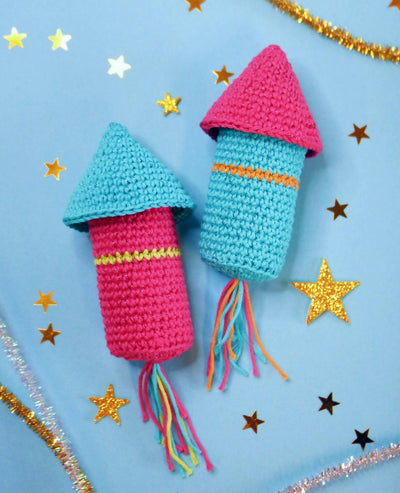 Nytårsraketten er hæklet i bomuld 8/4 med en glimmertråd i matchende farve som følgetråd. Af bomuld 8/4 skal der bruges følgende: