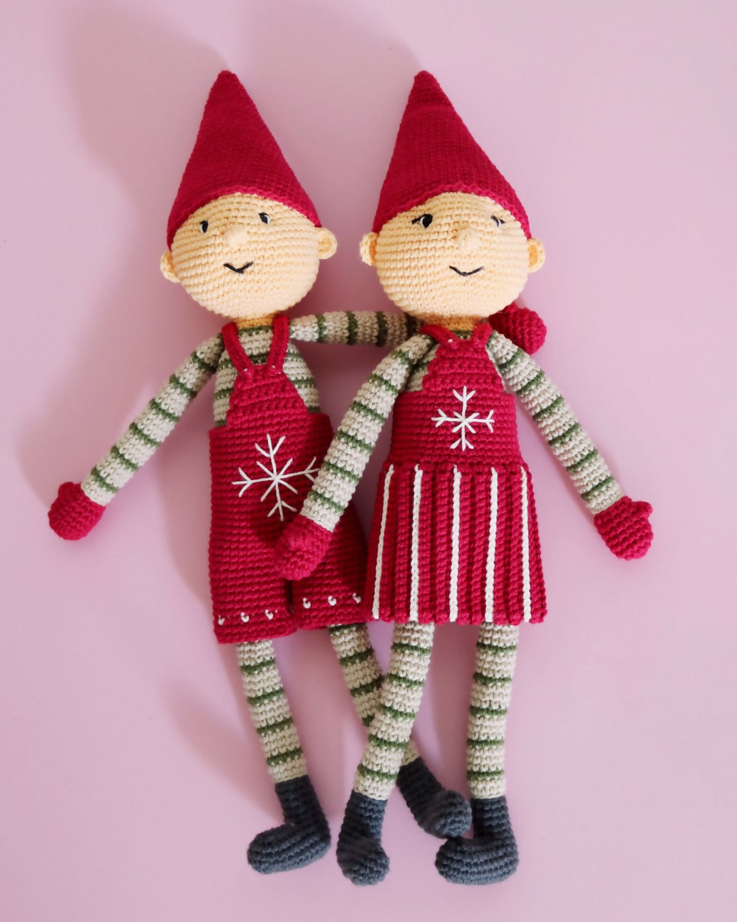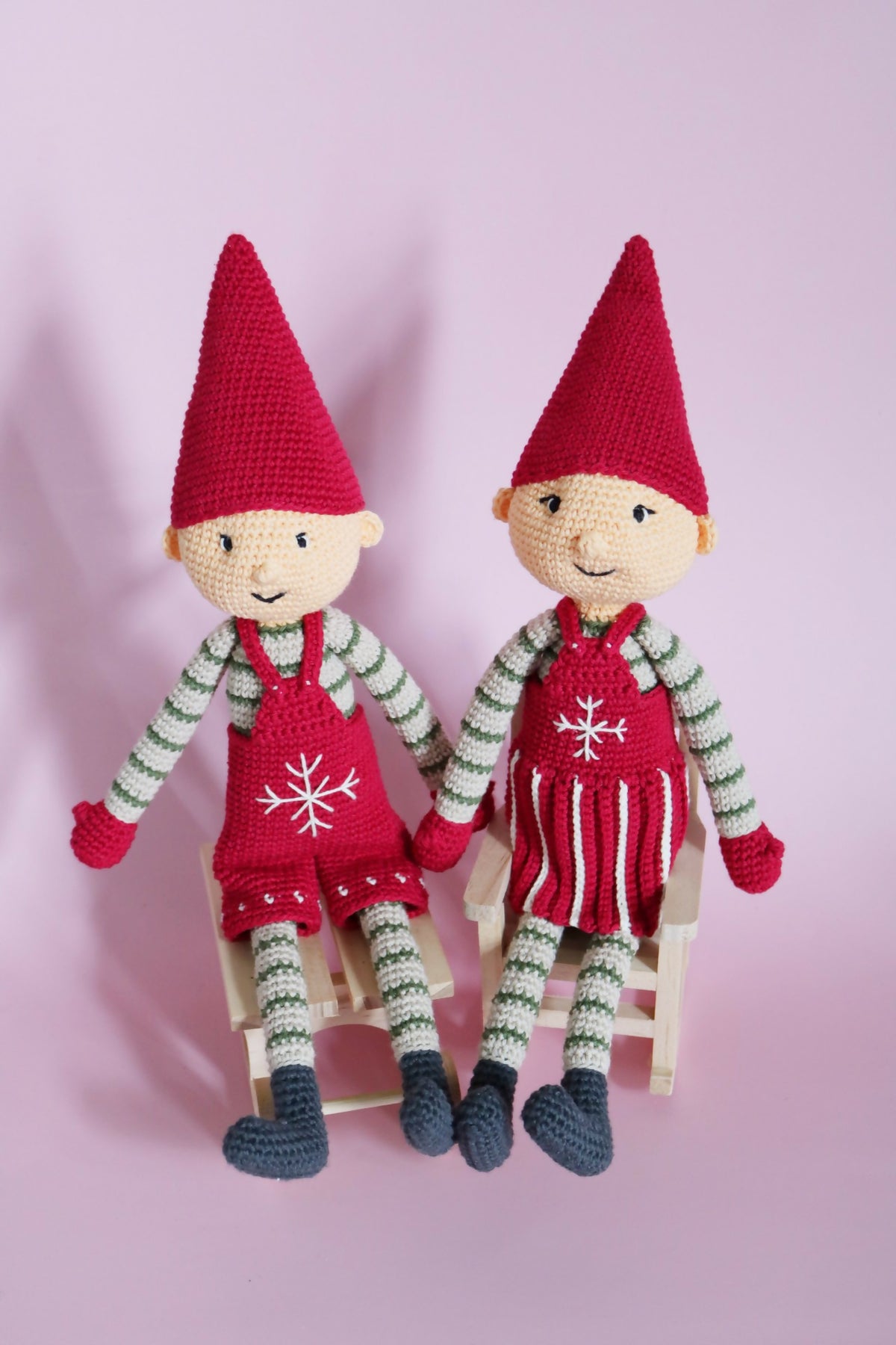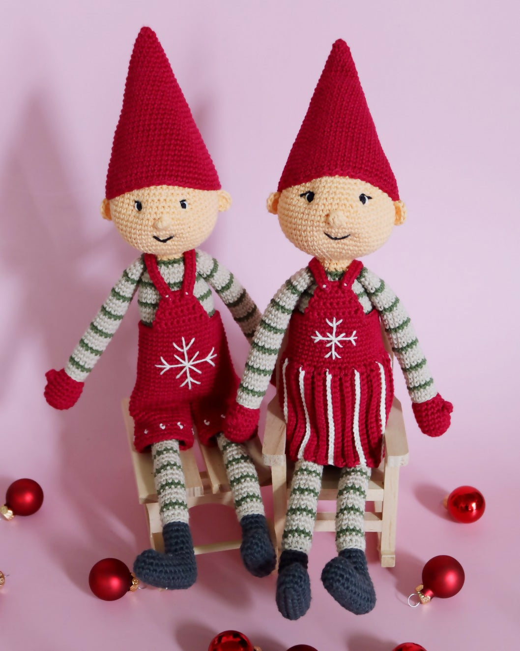 I hækleopskriften får du en detaljeret, udførlig hækleopskrift på de sødeste nisser Bella og Balder, i opskriften er der masser af henvisninger til videoer som viser og forklarer de forskellige teknikker.