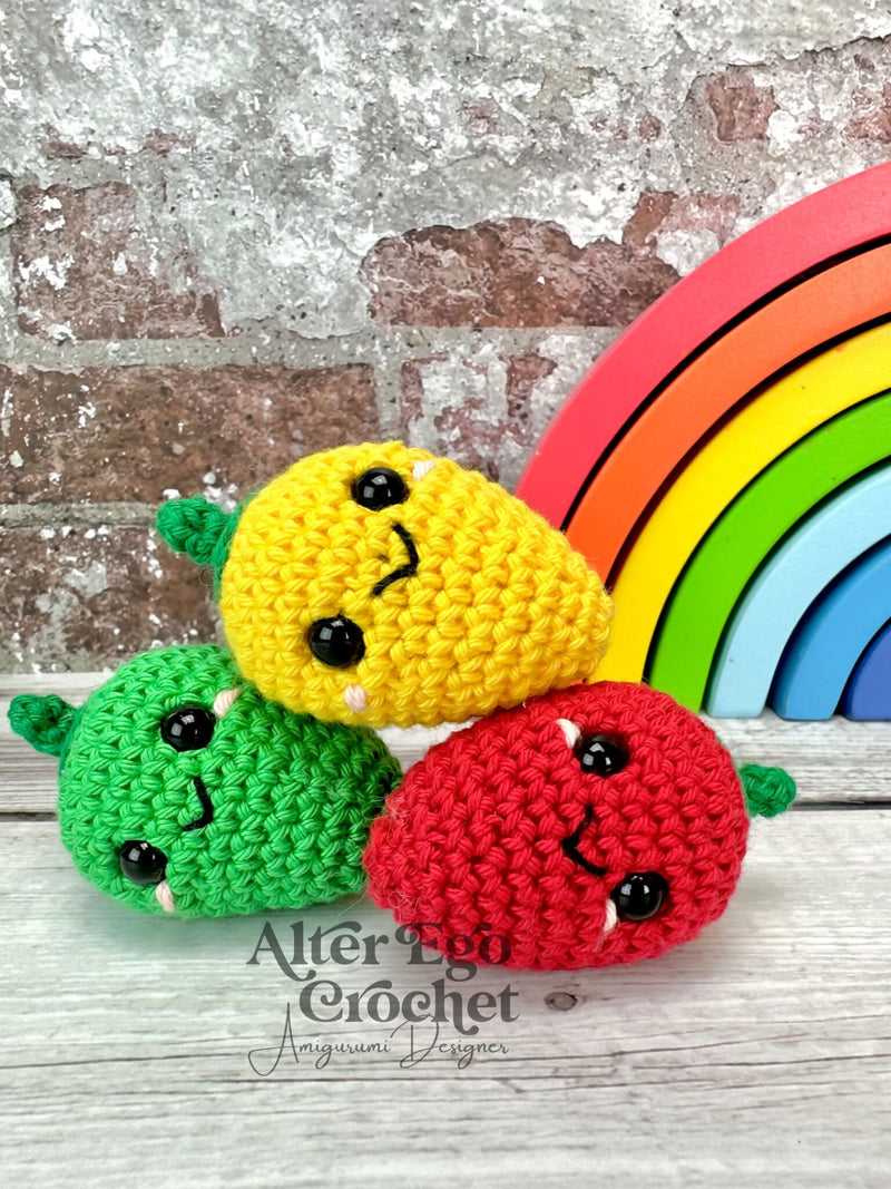 - Garn: Jeg har brugt 8/4 bomuld (4 g rød/gul/grøn, 1 g mørkegrøn og lidt lyserød)