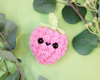 Bomuld 8/4: Hvis du i stedet vil hækle i bomuld 8/4 skal du bruge ca. 5 g lyserødt garn, 1 g grønt garn, en smule sort garn, 6 mm sikkerhedsøjne og hæklenål str. 2,0 mm. Så bliver den ca. 5,5 cm høj.