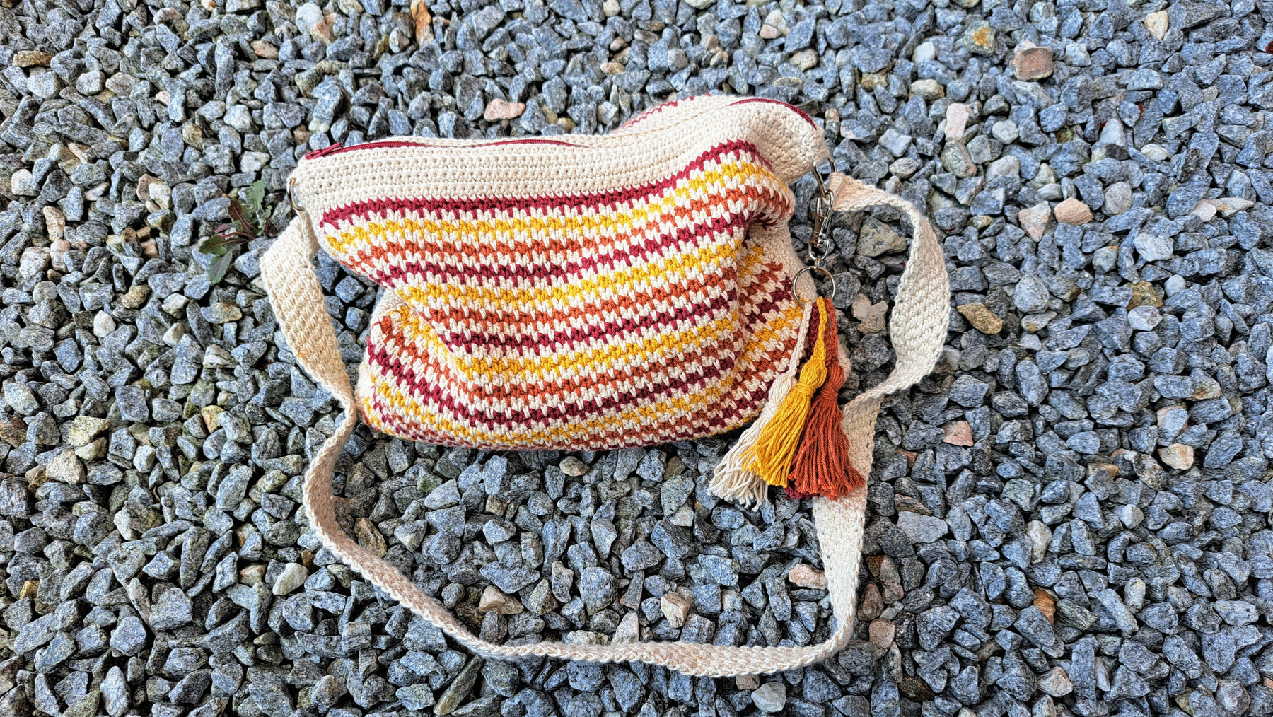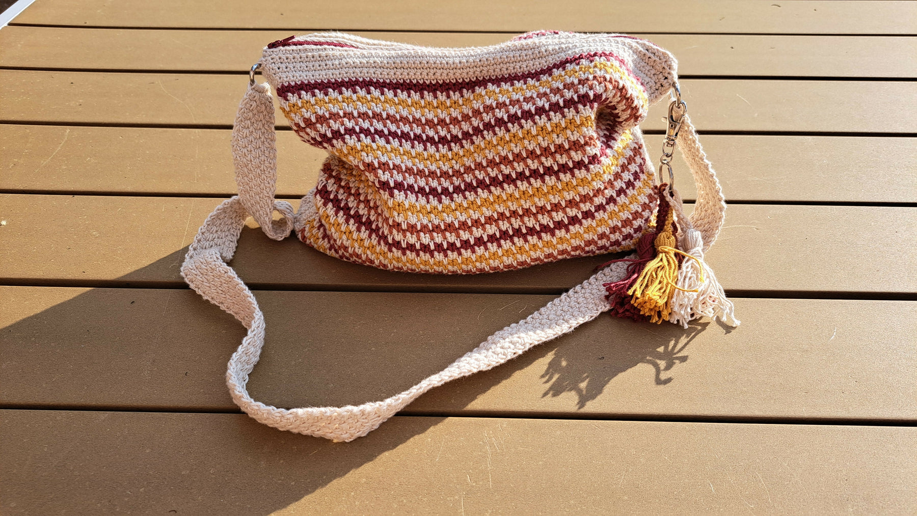 Autumn Vibes tasken er hæklet i økologisk bomuldsgarn i de smukkeste efterårsfarver. Garnet er fra Karen Klarbæk. Tasken har med sine 30 x 23 x 3,5 cm en god og praktisk størrelse.