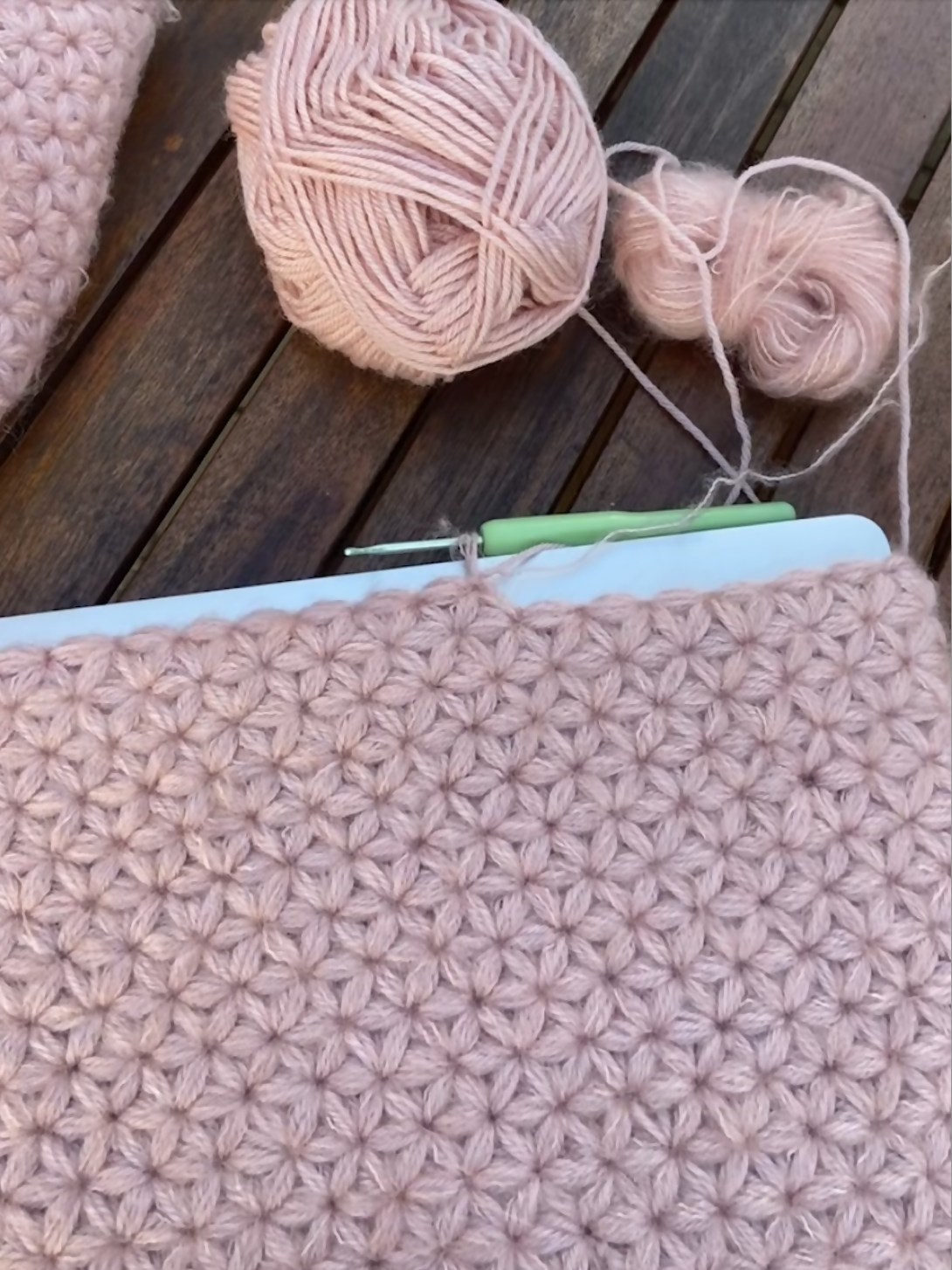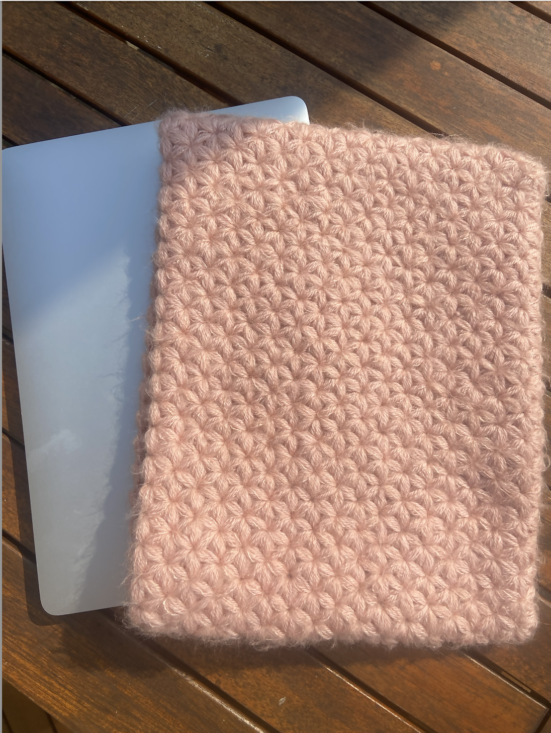Hæklet efter min 13-tommer MacBook. Opskriften passer derfor til de fleste computere. Du kan fjerne eller tilføje masker i første række, hvis du har andre ønsker ift. størrelsen eller fx. ønsker coveret til en iPad.