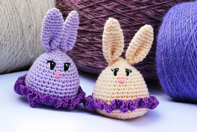 En lille pynte hare til hjemmet. Påske haren har fine broderet øjne, næb, to ører og et hæklet skørt. Den er omkring 5 cm høj uden ører. Hvis den skal bruges til børn ville jeg anbefale blot at bruge bomuldsgarn da det kan vaskes på 60 grader. Hvis den blot skal bruges til pynt kan du evt hækle skørtet i glimmergarn.