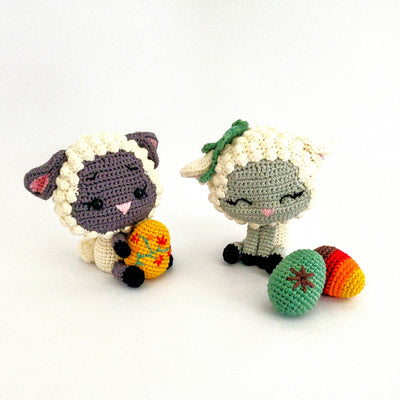Lammet Laban er en del af en hel familie; Fladnæserne. De bliver ca. 12 cm høje når de hækles på nål 2,5 mm af 8/4 bomuldsgarn.