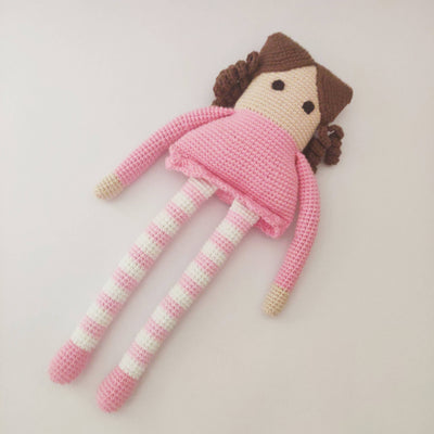 Dukke med firkantet hoved! Ja, hvorfor ikke. De er søde og der er lavet mange varianter. Denne dukke adskiller sig fra andre med sin korte krop. Den bliver ca. 30 cm høj/lang, når de hækles i 8/4 bomuldsgarn på nål 2,5 mm.