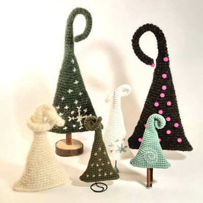 Opskriften byder på træer i to størrelser. Når de hækles i enkelt 8/4 bomuldsgarn bliver de enten 15 eller 22 cm. Men man kan jo bare hækle dem i dobbelt eller 3 dobbelt garn eller måske endda i uldgarn, som kan filtes. Mulighederne er mange og helt op til hvad du har lyst til.