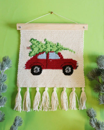 For at hækle dette vægophæng med bil med juletræ skal du udelukkende bruge bomuld 8/4. Du kan bruge det mærke du foretrækker, men jeg har brugt Infinity Hearts Rose 8/4 og Lammy cotton 8/4. Nedenfor kan du se hvor meget der skal bruges af hver farve: