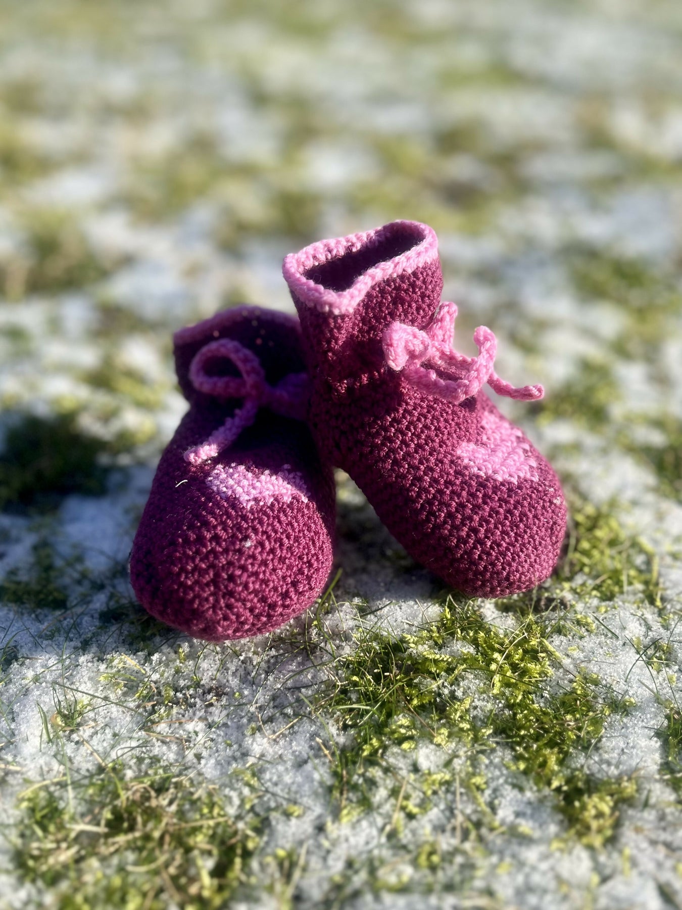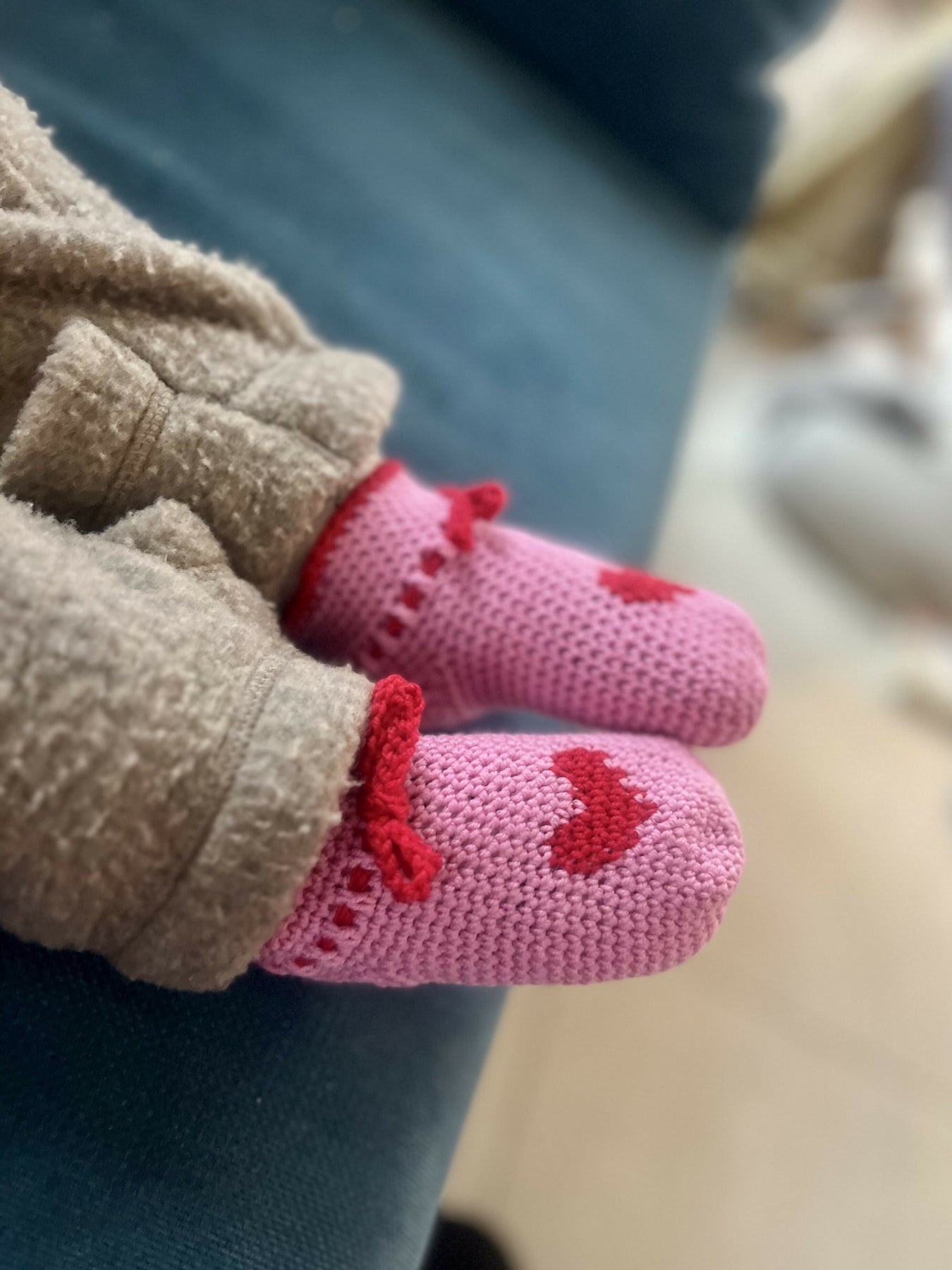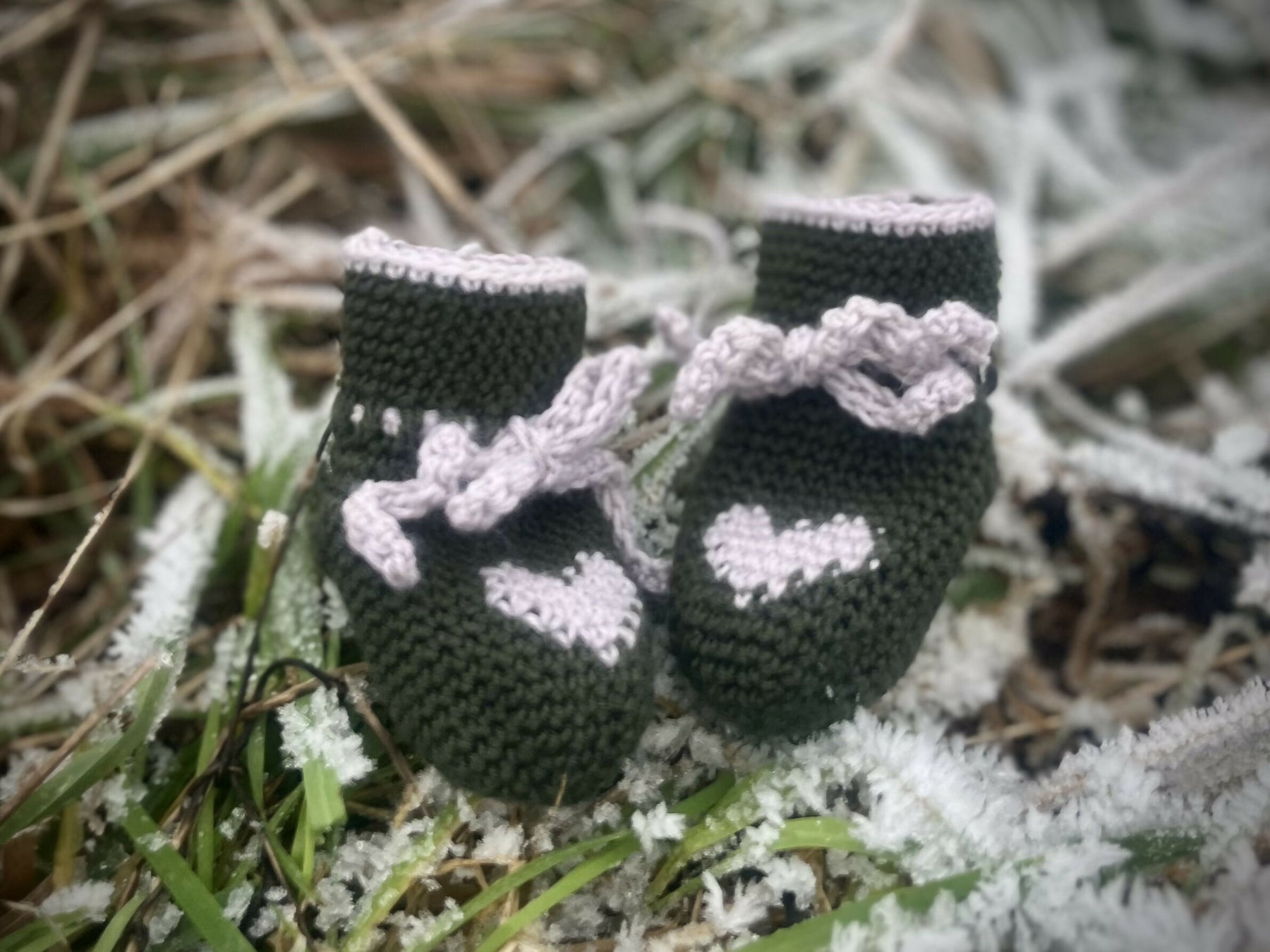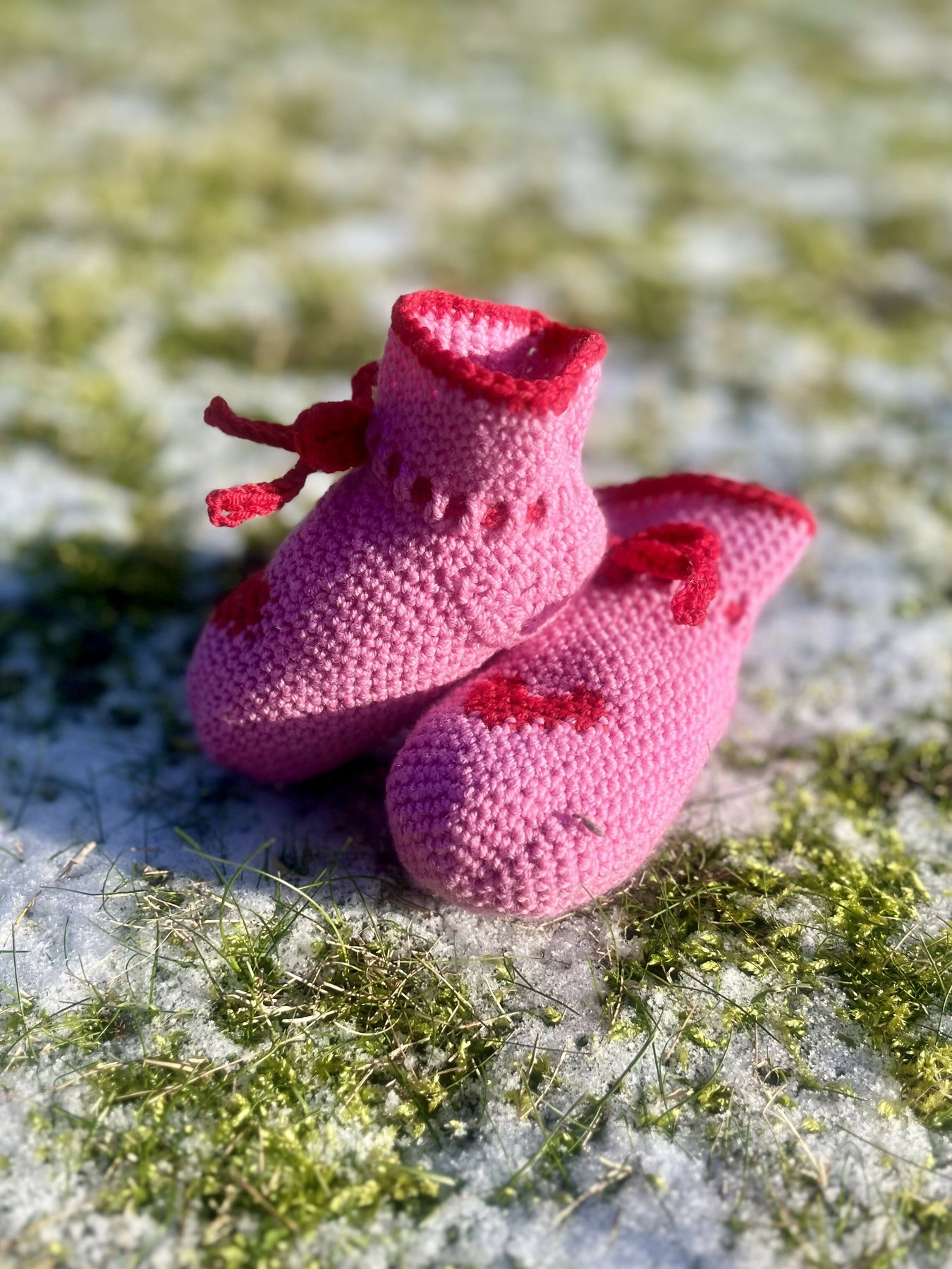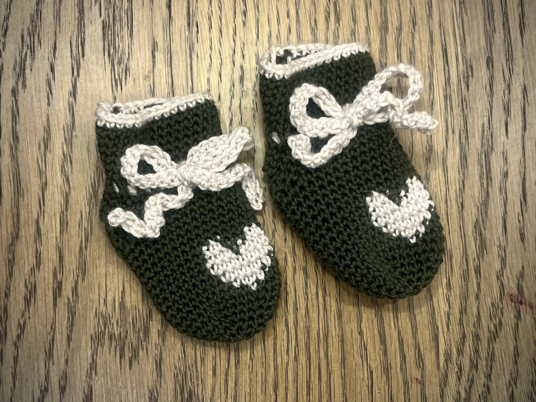 I hækleopskriften bliver du grundigt guidet trin for trin og med relevante billeder undervejs. Derudover er der skrevet en udførlig beskrivelse af farveskift omkring hjertet og stgm indt ved hælen.