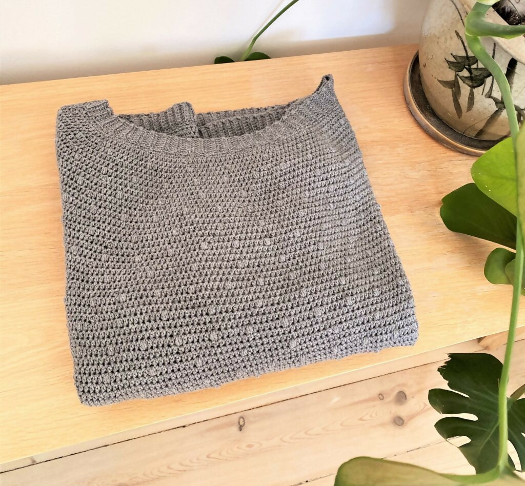 Den er hæklet oppefra og ned og rundt i spiral med halvstangmasker.