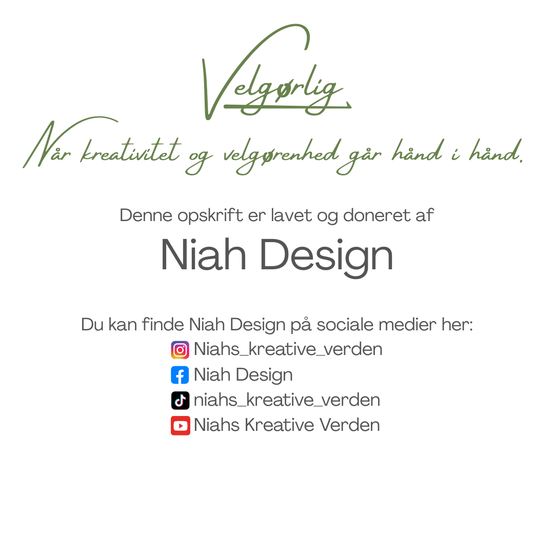 Hvis du er vandt til at bruge en anden størrelse hæklenål kan du sagtens gøre dette, men garnmængde og størrelse kan variere. Jeg hækler middel til løs – hvis du hækler middel til stram vil jeg anbefale at du bruger nål 2,5 mm, og hvis du hækler stramt vil jeg anbefale at du bruger hæklenål 3,0 mm. Tjek evt hæklefasthed.