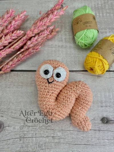 Ernie bliver 7 x 8 cm. hvis du bruger samme garn og hæklenål som mig. Du kan sagtens bruge en anden nål og andet garn, hvis han skal være større eller mindre.