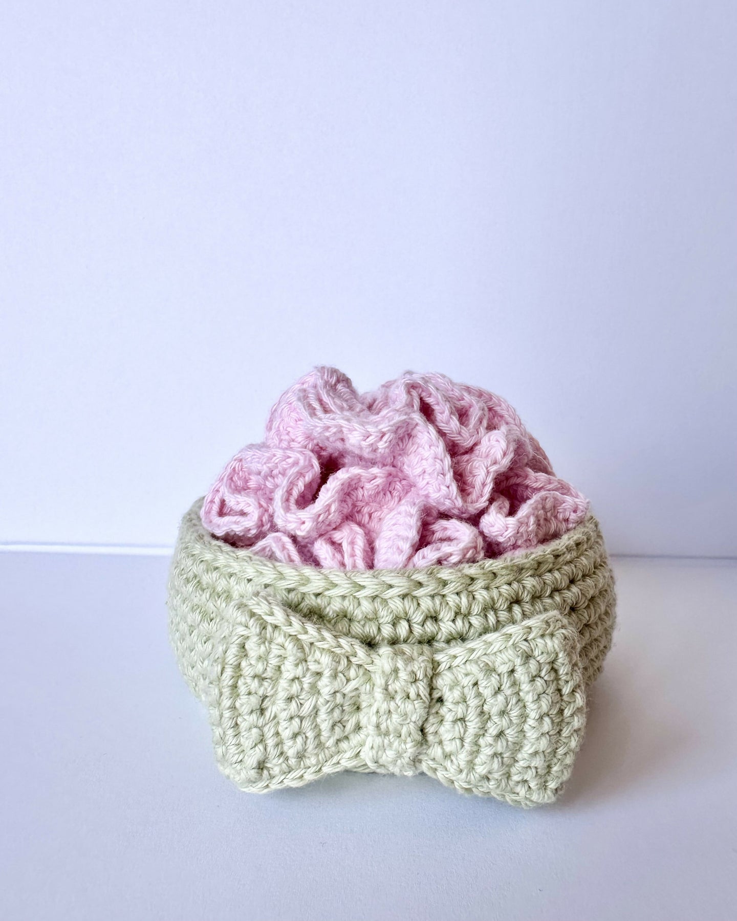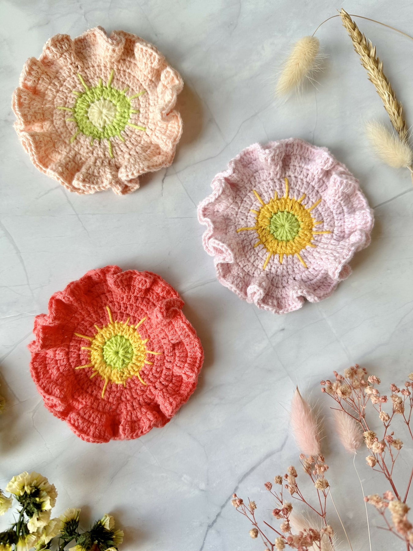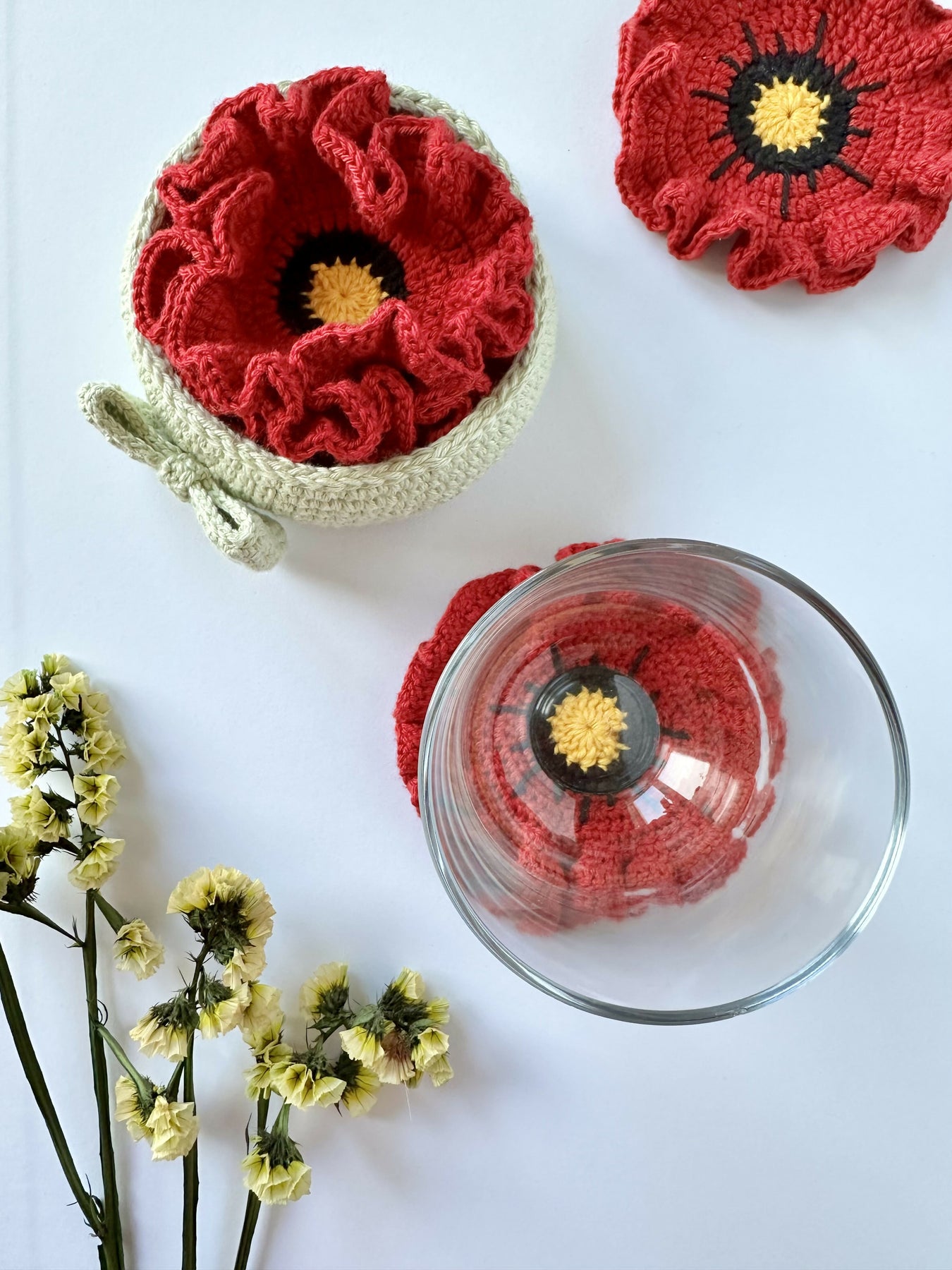 Hækleopskrift på Valmue-coaster & Sløjfe-kurv