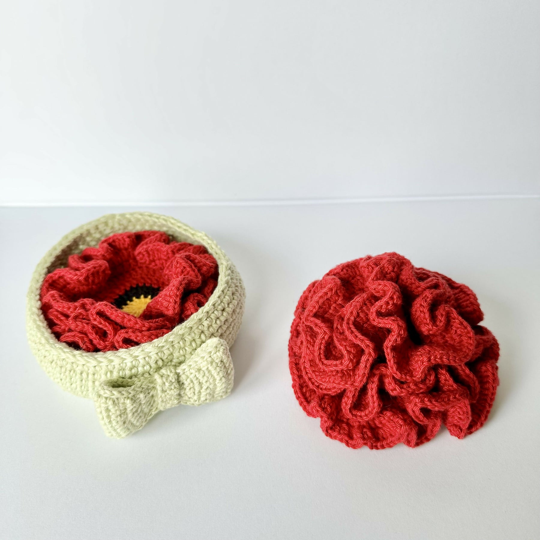 Skab blomstrende hygge med denne hækleopskrift på en elegant valmue-coaster og en stilren kurv med sløjfe. To dekorative og funktionelle projekter, der passer perfekt som bordpynt, gaveidé eller opbevaring af småting.
